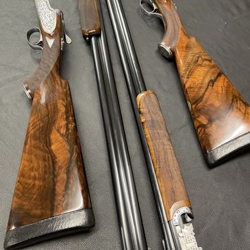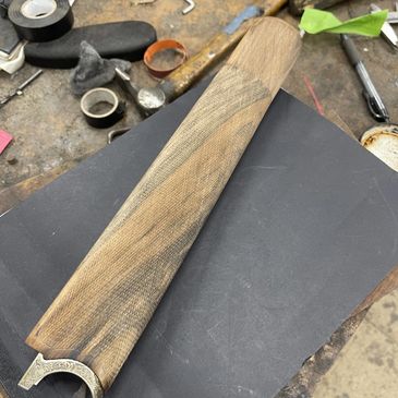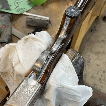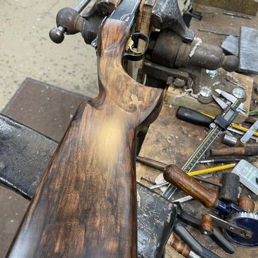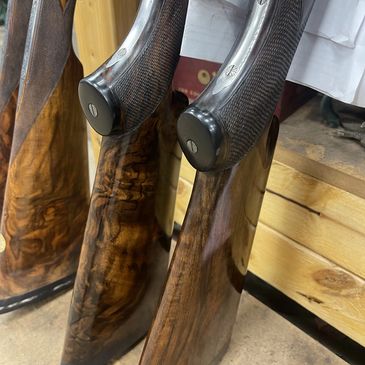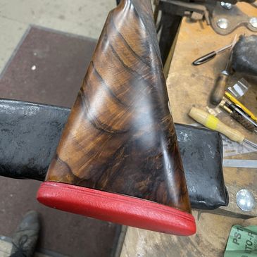 The video is a competition shooters custom factory headed stock with horn heel cap. The forend was lengthened 2 and 1/2 inches to accommodate a longer reach.