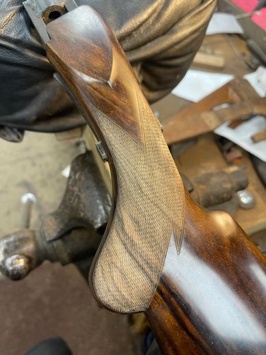 Chequering is the diamond pattern you will see on the stock and the forend where the hand grips the gun. Re-chequering a gun stock can significantly improve gun handling.